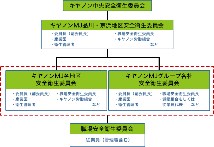 キヤノンMJグループでは、安全衛生の最上位機関として安全衛生担当役員(上席執行役員)が委員長を務める「品川・京浜地区安全衛生委員会」を設けるとともに、「キヤノンMJグループ安全衛生活動方針」を作成し、グループ各社・各地区・各職場単位で組織的に展開しています。 各社・各地区において、労使で構成する安全衛生委員会を設置するだけでなく、その下部組織として日常の職場における活動を推進する職場安全衛生委員会を設け、従業員一人ひとりが積極的に安全衛生活動に取り組んでいます。