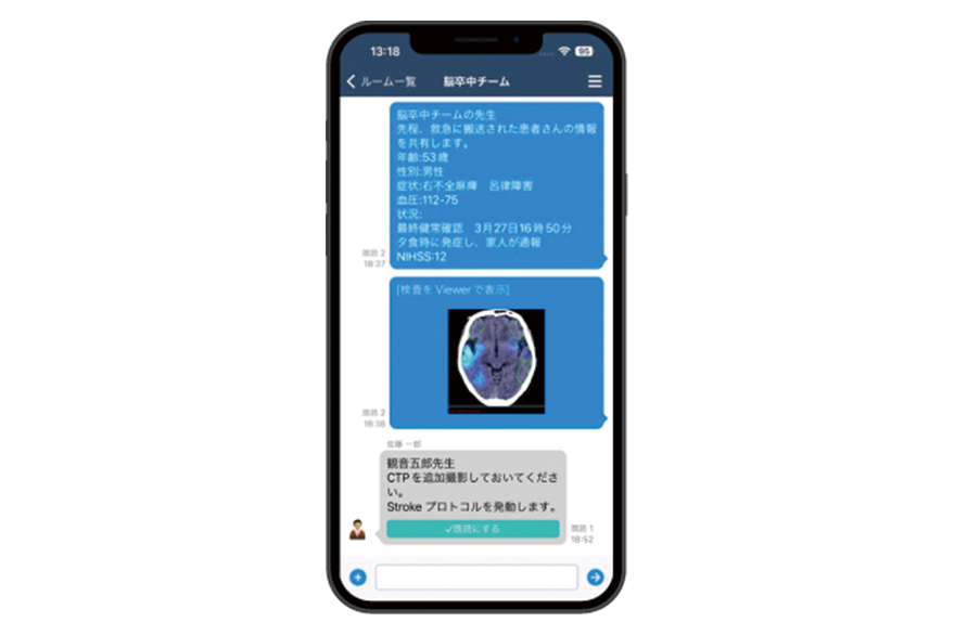 本アプリは、「Medical Image Place モバイル画像参照サービス※1」と連携することで、チャットと医用画像を組み合わせた医師ならびに医療従事者間のコミュニケーションを実現します。従来の電話やメールによるコミュニケーションに比べ、時間や場所を選ばずに複数の関係者と、患者の状況や診療内容をより正確に共有することが可能です。また、既読を確認する機能により、チャットを閲覧した関係者を個別に把握することで、送信後のコミュニケーションを円滑に進めることが可能です。主治医や高度な診断を行う専門医との連携強化を図ることで、迅速な判断ができるだけでなく、不要不急な医師の呼び出し低減を支援します。これにより、医療の質の向上と労働時間の削減の両立に貢献します。