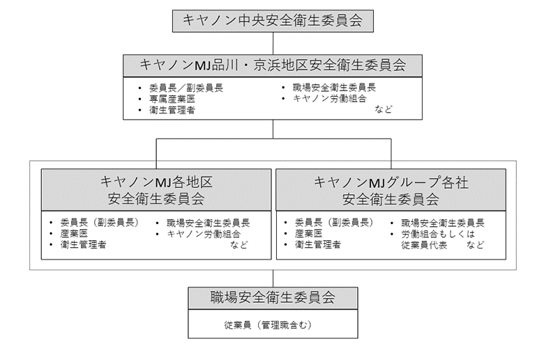 キヤノンMJグループでは、安全衛生の最上位機関として安全衛生担当役員(上席執行役員)が委員長を務める「品川・京浜地区安全衛生委員会」を設けるとともに、「キヤノンMJグループ安全衛生活動方針」を作成し、グループ各社・各地区・各職場単位で組織的に展開しています。 各社・各地区において、労使で構成する安全衛生委員会を設置するだけでなく、その下部組織として日常の職場における活動を推進する職場安全衛生委員会を設け、従業員一人ひとりが積極的に安全衛生活動に取り組んでいます。