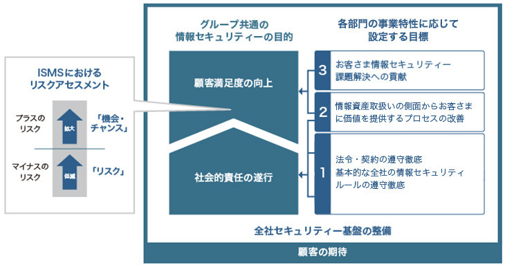 この二つの目的を達成するために、「法令・契約の遵守、基本的な全社の情報セキュリティー関連ルールの遵守徹底」「情報資産取り扱いの側面からお客さまに価値を提供するプロセスの改善」「お客さまの情報セキュリティー課題解決への貢献」の3つの目標を、各部門の事業特性に応じて設定し、活動を行っています。