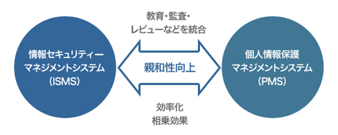 ISMSやPMSなどのマネジメントシステムでは、それぞれ教育や監査、レビューなど共通する取り組みがあります。 そこで、これらの共通事項をまとめて行い、リスクアセスメントなども重複しないよう連携して実施することにより効率化しています。
