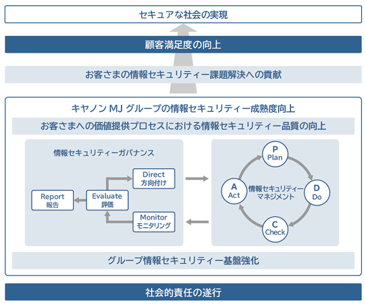 キヤノンMJグループでは、「セキュアな社会の実現」に寄与するために、経営層による「情報セキュリティガバナンス」に基づき、「情報セキュリティマネジメント」を推進し、キヤノンMJグループ内の情報セキュリティ成熟度の向上に取り組んでいます。
