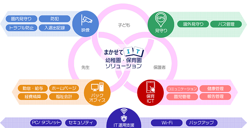 幼稚園・保育園事業者の安全対策強化と業務効率化におけるIT機器の選定、導入、運用、保守までをトータルで支援するサービスです。