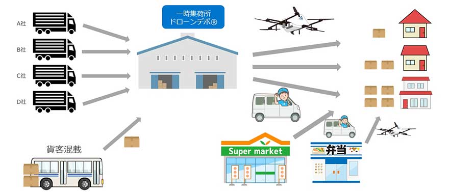 SkyHub®は、ドローン輸送と陸上輸送を用いた共同配送の仕組みです。物流各社の荷物を一時集積所である「ドローンデポ®」に集積し、次世代輸送配送管理システム「SkyHub® TMS」を用いて最も効率の良い配送方法を算定し、その結果をもとにドローンまたは陸上輸送によって各家庭に荷物を届けます。