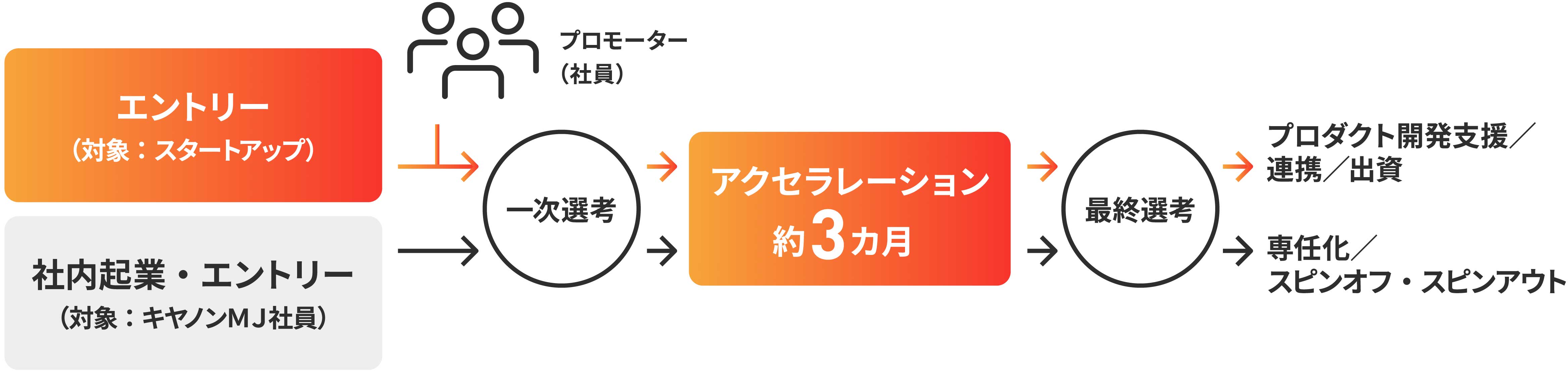 スタートアップ向けのアクセラレーションプログラムと、CMJグループ社員を対象とした社内起業家プログラムを統合した形で実施するプログラム。社内外の挑戦者一人ひとりが主役となり、相互に作用することで輝く未来を創造する場です。デザイン思考力に秀でた社内の「プロモーター」が、共創支援者としてスタートアップの皆さんとの協業・事業検証をサポート。また、アクセラレーション期間には事業創出の専門知識を有する「事業開発アクセラレーター」が伴走・メンタリングを実施します。