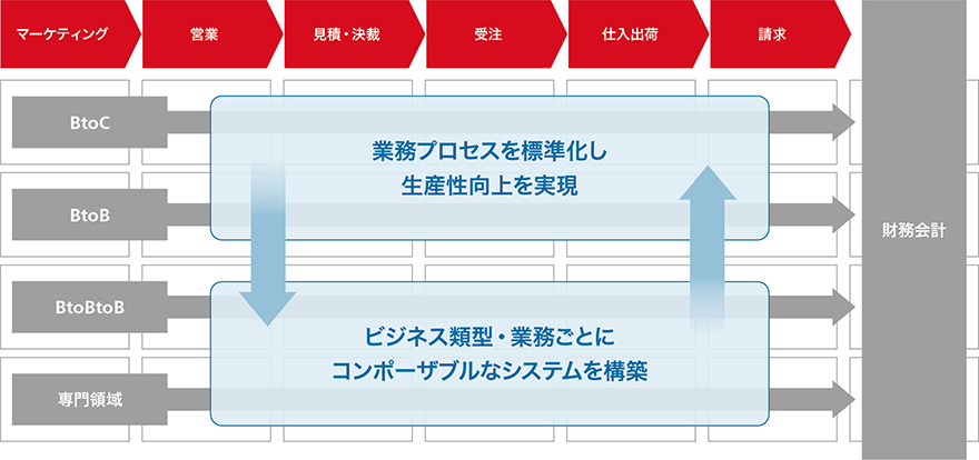 BtoB/BtoC/直接販売/間接販売などの多様な事業モデルに対し、それぞれの強みとなる固有のプロセスと事業共通の業務プロセスを整理し、共通プロセスの徹底した効率化と標準化・自動化を図ります。少ない人数による効率的な業務オペレーションを可能にし、生産性向上を実現することで、バリューチェーンの最適化を図るとともに、事業モデルごとの競争力を高めていきます。
