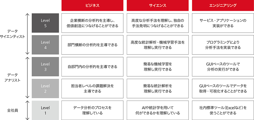 「一般社団法人 データサイエンティスト協会」が定める「データサイエンティスト」の3つのスキルセットを基軸として、当社の現状における課題や目指すべき姿を反映させたスキルレベルの定義を行っています。