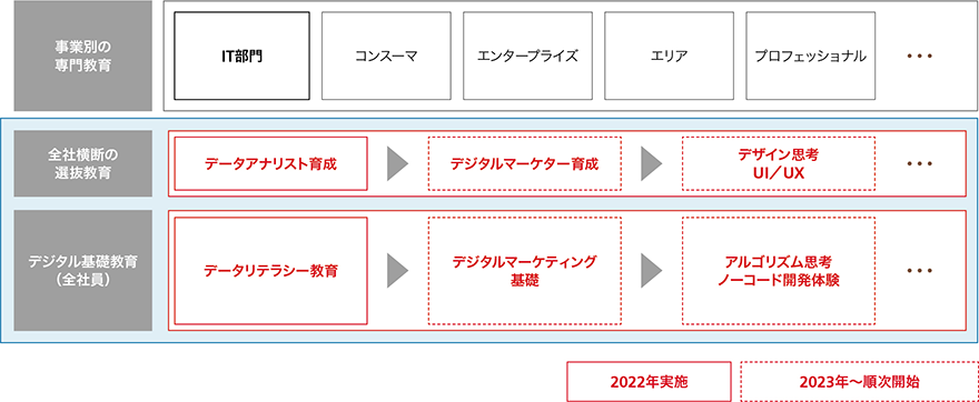 2022年には「全社員」および「選抜社員」向けの教育の第1弾としてデータリテラシー教育およびデータアナリストの育成を開始しました。これと並行して、2023年以降はデジタルマーケティングおよびUI/UXに関する全社員向け教育および選抜教育を順次開始しています。