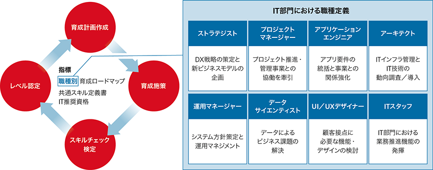 事業に関する知見とITの専門分野に関するスキルを持ち合わせた高度な人材の育成を目的として、IT部門における職種定義と、それぞれのスキルモデルの定義を行っています。