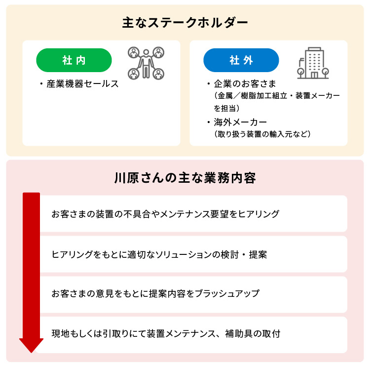 産業機器エンジニアは、お客さまの元へ出向き、メンテナンスの提案や見積もり、装置の移設などを行っています。川原さんの担当は、日本の製造業のお客さまに対して、海外メーカーの検査装置や分析装置の設置から立ち上げ、アフターサポートまで行うこと。自ら現場に足を運び、製品の製造過程をサポートするだけでなく、より良い改善策を提案することでお客さまの近いところで業務をより良い方向に導くことができる仕事です。