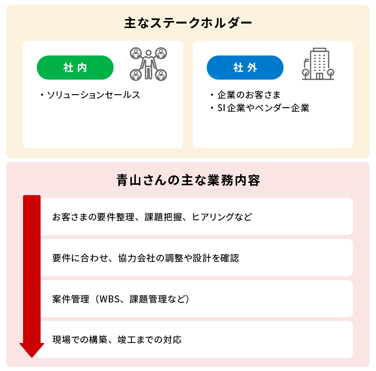 ソリューションエンジニアとして、2020年にキャリア採用で入社した青山さん(仮名)。前職の通信建設会社では、通信インフラの設計構築、施工管理を担当していました。キヤノンMJがITソリューション事業に注力していると知り、さらに上位レイヤーに関わりたいと転職を決意。これまでの経験やスキルを活かし、案件PM(プロジェクトマネジメント)の即戦力として活躍する働き方の裏側に迫ります。