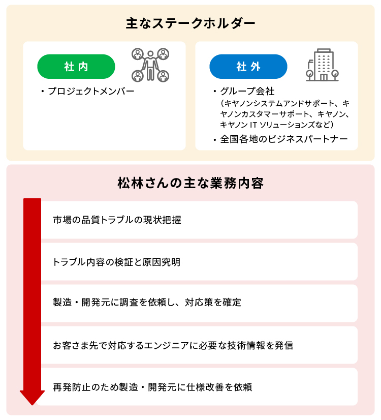 ソリューションエンジニアの中で、アフターサポートの領域における品質管理を担っています。お客さまにキヤノンMJグループが提供している製品・サービスを安心・安全にご利用いただくために、「市場で稼働しているキヤノン製品の品質管理」と「新製品の立ち上げや市場サポート体制の確立」を遂行しています。