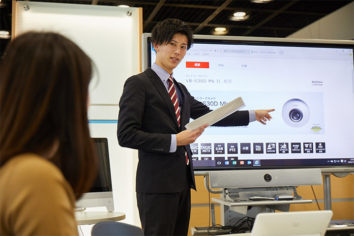 担当するネットワークカメラやそれに関連するソフトウエアなど学ぶべきことは山のようにあります。お客さま対応を担う全国のエンジニアからの問い合わせや相談に迅速に答えるために、日々知識と経験を積み重ねています。不明な点は製品のすみずみまで熟知したスペシャリストである先輩方の助言を得て吸収し、自身の専門性を高めています。これからはキヤノン製品のみならず、海外製品を扱う機会も増えると思うので技術力と英語力を磨き、少しでもお客さまのお役に立てればと思っています。