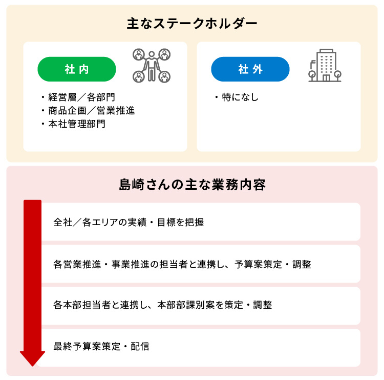 キャリア採用で入社し、エリアビジネスユニットの実績分析や財務目標設定などを行う事業推進スタッフとして配属された島崎さん(仮名)。前職で培った会計知識が今の業務にどう生きているのか、また管理会計と事業投資の領域でのキャリアアップについて、話を聞きました。