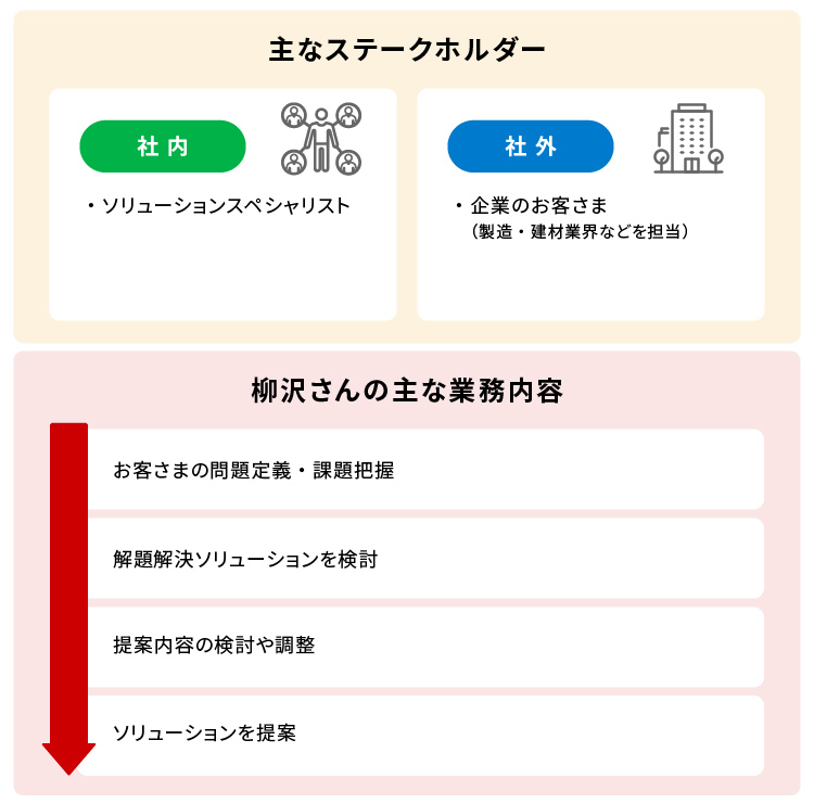 ソリューションスペシャリストと連携し、お客さまの課題に寄り添い、解決へと導く提案をするソリューションセールスの柳沢さん(仮名)。前職での営業経験を活かして、新たに設けられた事業部に、ソリューションセールスの即戦力としてキャリア入社しました。常にお客さまの声に熱心に耳を傾けることで、真の課題解決を目指す柳沢さんに、ソリューションセールスの仕事について話を聞きました。