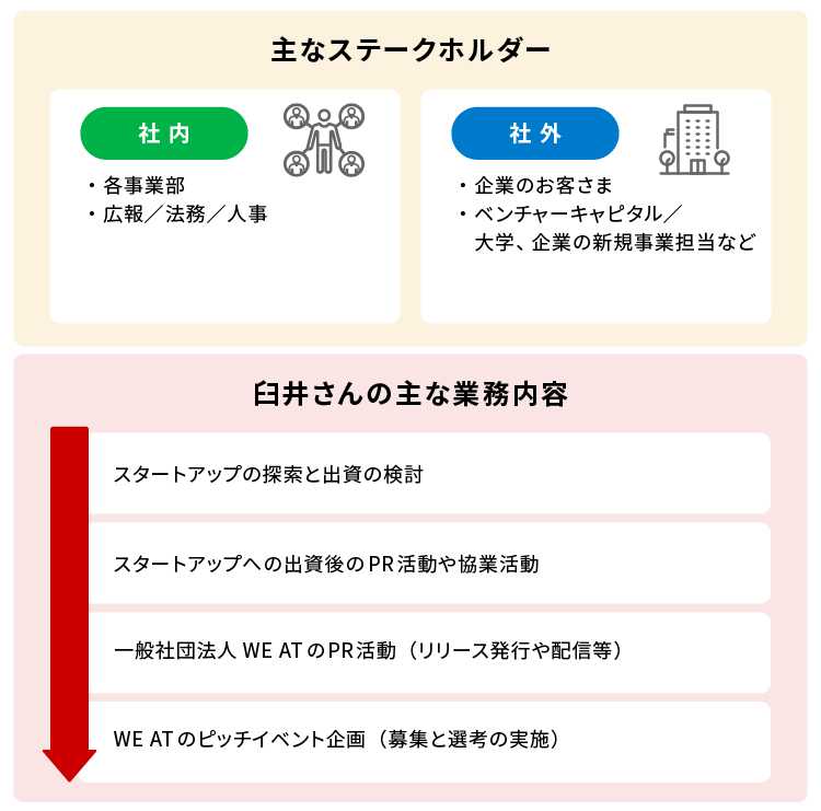 営業、本社部門での経営企画、経営戦略の業務を経て、立ち上がったばかりの組織で新規事業創出に向けたスタートアップ出資や産官学連携プロジェクト推進などに携わる臼井さん(仮名)。「まるで社内で転職をしたみたい」と話すほど、それぞれの役割で求められる知識や技術はさまざま。どんな場所でも常にポジティブに、自分をアップデートさせながら日々の仕事に全力で向き合う。そんな臼井さんに話を聞きました。
