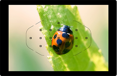 ピントを合わせるようなアニメーションで実際のファインダーを覗いて撮影しているような体験ができます。
