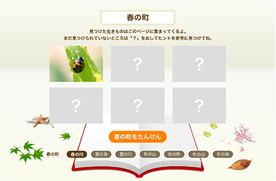 さまざまな環境に暮らしている生きものや自然の“ふしぎ”を、その習性をヒントに探しあてるといった宝さがしゲームのようになっています。