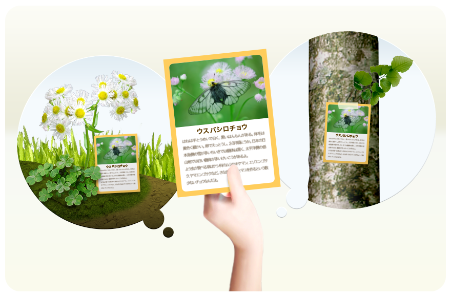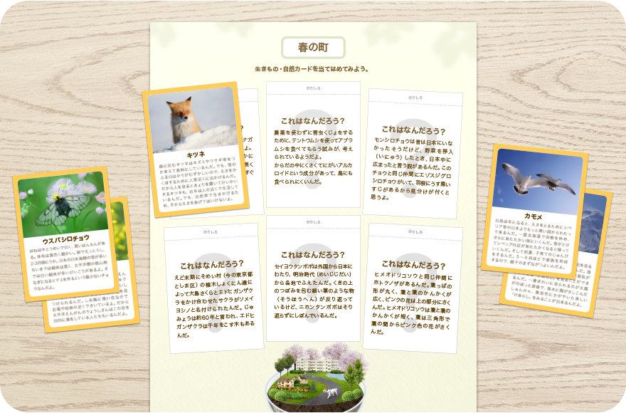 テーブルの上に広げてお使いいただくこともできますし、学校の校庭など広い場所を使い、たとえば校庭の○○の花の近くに○○チョウのカードを隠すなど、生きものの習性がヒントになるような場所に生きものカードを隠して見つけるといった宝さがしのような遊び方も楽しめます。