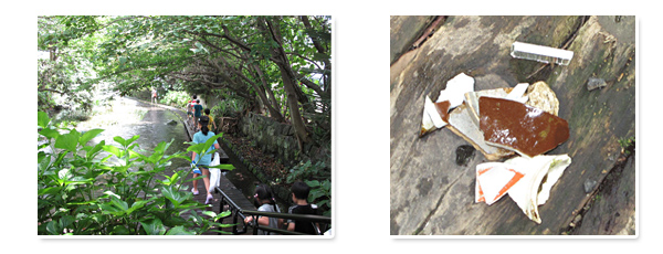 「ちゃんかけ」とは、昔捨てられたお茶碗などのかけらです。「ちゃんかけ拾い」は、川底にあるちゃんかけを拾う清掃・美化活動です。