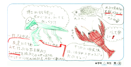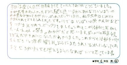 楽寿園や源兵衛川での生き物の説明がわかりやすく、自然観察したという気分になりました。川の清掃も時間があれば、あと少しやりたいなという気持ちでした。子供たちの興味津々な表情が大変印象的でした。
