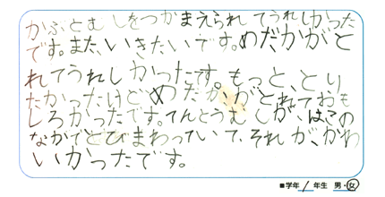 何種類もの昆虫を観察することができました。 先生から聞く昆虫の生態のお話しにも、驚きが沢山つまっていて、 子どもたちも表情を輝かせていました。