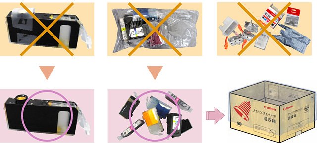 インクカートリッジ回収時には、なるべくインク供給口に粘着テープ等を貼らないでください。これらがリサイクルの妨げになります。また箱や袋などを取り除いて回収箱に入れてください。
