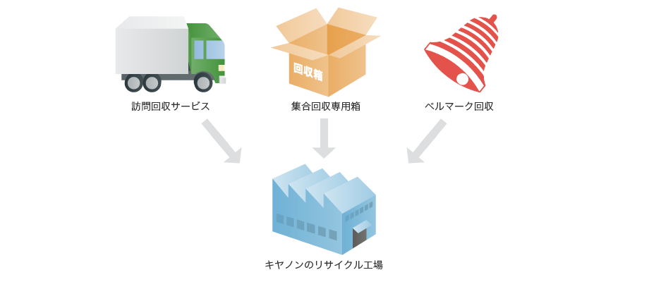1990年、キヤノンは世界に先駆けて「トナーカートリッジ回収リサイクルプログラム」を開始し、1996年には「インクカートリッジの回収リサイクル」をスタートしました。以来、「地球環境保全と資源の有効活用」を目的とし、使用済みカートリッジのリサイクルを続けています。回収した使用済みカートリッジは埋め立てることなく、すべてを資源として有効利用致します。回収にはお客さまのご協力が不可欠です。使用済みカートリッジの回収にご協力をお願い致します。