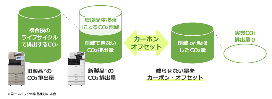社会全体のCO2削減活動(森林保全や企業などの省エネ活動)を支援し、気候変動の防止に貢献するために、オフィス向け複合機と一部のプロダクションプリンターの製品ライフサイクル全体で排出するCO2について、カーボン・オフセット※1を行う仕組みをご用意しています。