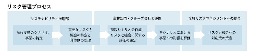 気候変動に関する事項を所管するサステナビリティ推進部は、グループ会社内の関係部署と連携の上、気候変動の影響によるリスクと機会の特定を主導し、状況の把握を行います。さらに、それぞれのリスクと機会に対する対応・対策を検討し、サステナビリティ推進委員会に報告・付議します。特定した気候変動の影響と内容に応じて全社リスク管理部門に対しても報告・提言を行うことで気候変動の影響を全社リスクマネジメントに統合する役割を担っています。
