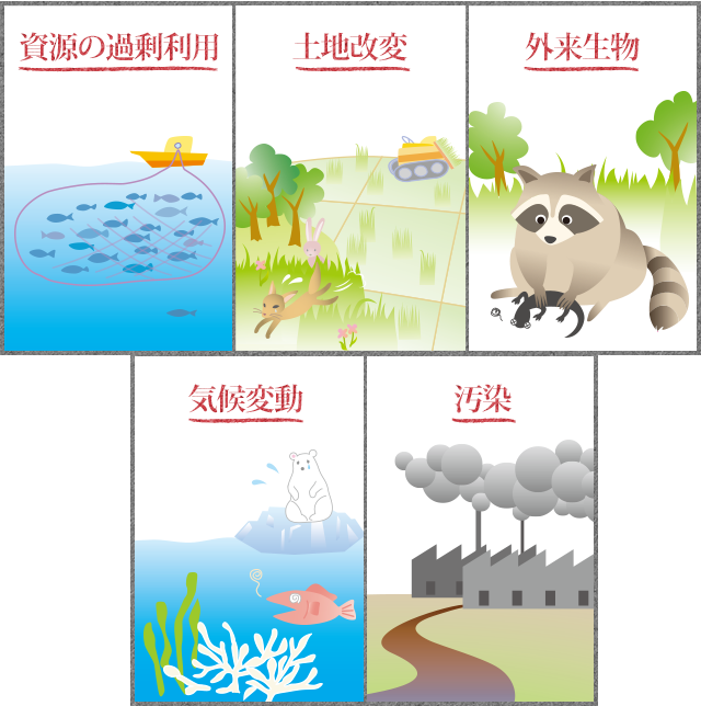 その原因には、「資源の過剰利用」「土地改変」「外来生物」「気候変動」「汚染」などがあります。