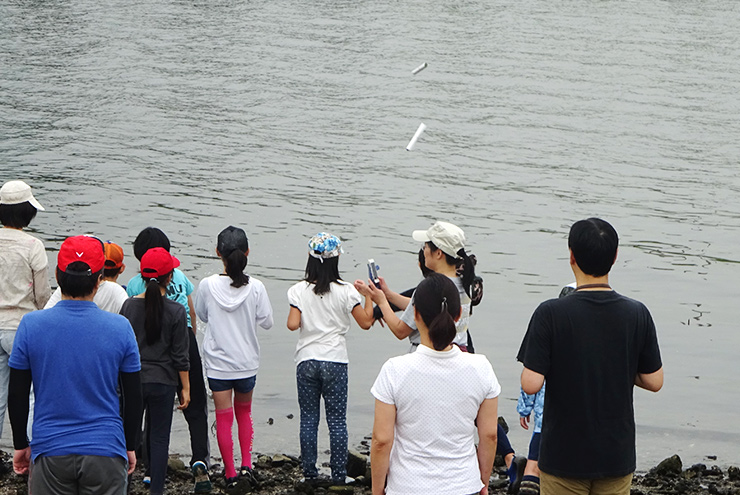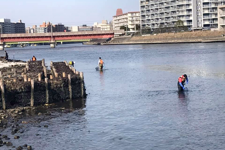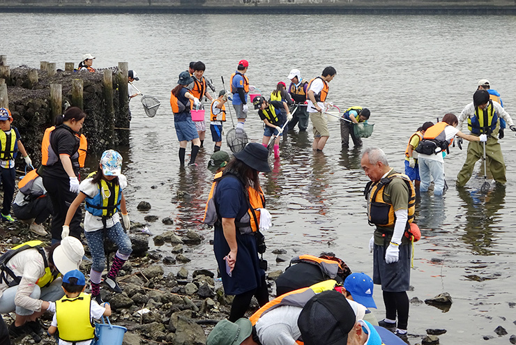 貝殻浜でお魚とりをしました。こんなところにお魚がいるのかなと思いますが、実はたくさんのお魚が暮らしています。都市河川の生物多様性を実感しました。
