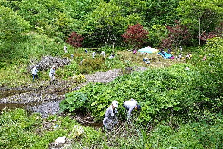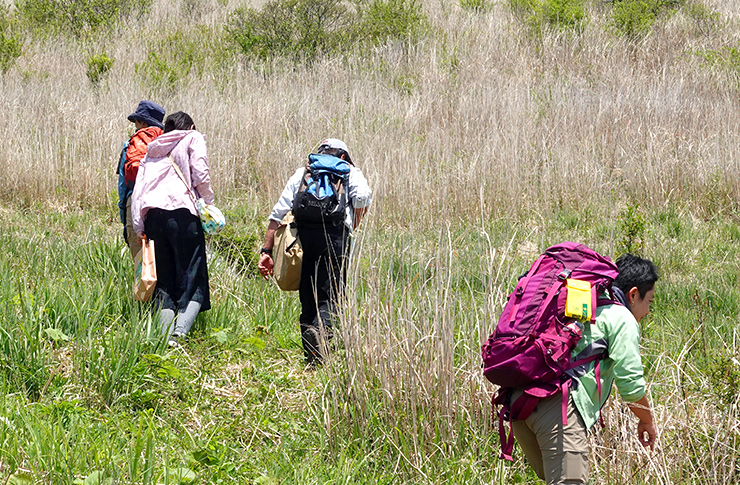 4年目を迎えたオオハンゴンソウの防除活動に、総勢48名が参加しました。継続は力。昨年に比べ個体が減少し、予定終了時間より前に確認できた株をすべて抜き取ることができました。