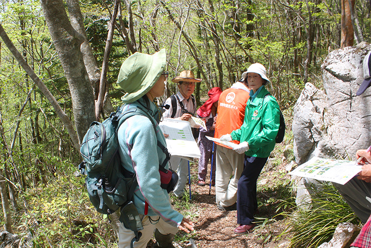 オオキンケイギクの防除活動の後、牧野植物園の職員の案内で観察会をおこないました。ヤマツツジやテイカカズラ、ニガイチゴやワレモコウなどさまざまな植物を観察し、豊かな自然を満喫しました。