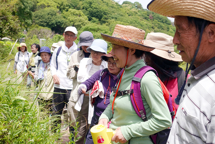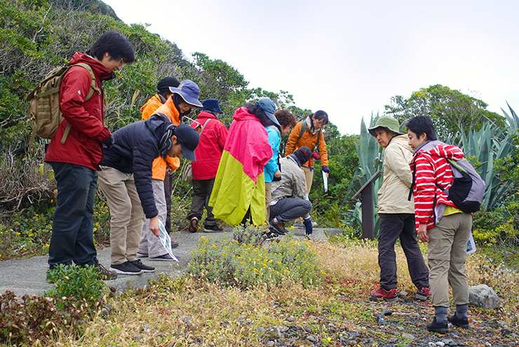 シオギクの自生地室戸市での観察会。本来この地域に自生することのないノジギクが人の手によって持ち込まれ、シオギクと交雑したことで、雑種群が見られるようになりました。まずは地域住民とともに現状を確認します。