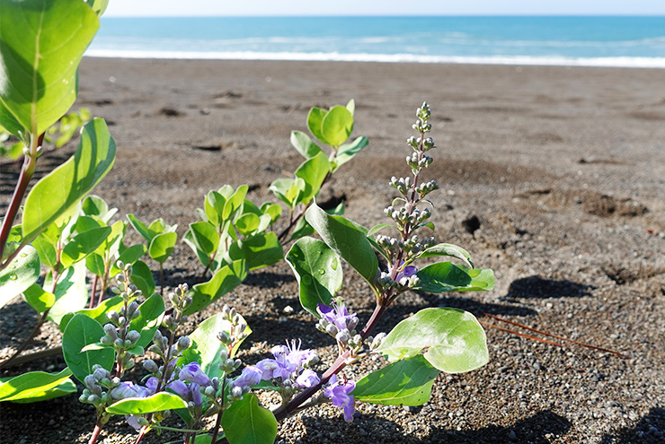 近年、この周辺には外来植物のナルトサワギクがはびこりはじめました。本州から沖縄の浜辺に群生するハマゴウは、琴ヶ浜でもおなじみの植物。当たり前に見られる風景ですが、次世代に残したい地域の宝物のひとつです。