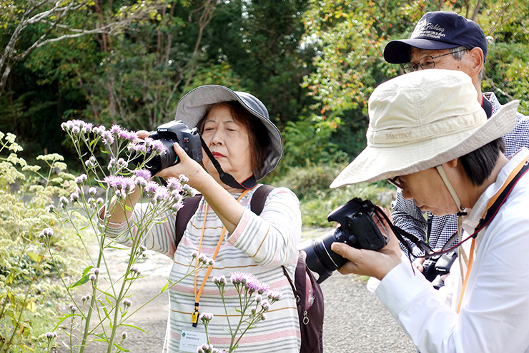 写真教室での一コマ。午前は生物多様性についての講座、午後は写真撮影の実習を行いました。植物のあるがままの美しさや特徴、その周りに集まる生き物の姿を捉えようと、みんな真剣にファインダーを覗き込みました。