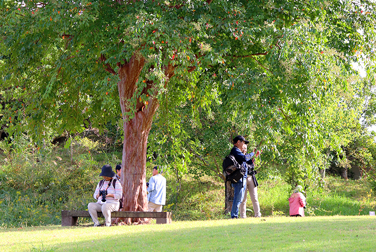 牧野植物園内の芝生広場を会場に開かれた写真教室。芝生広場のシンボルツリー「シマサルスベリ」の木陰で本日の成果を確認中の参加者の皆さん。今日のベストショットはどれかな?