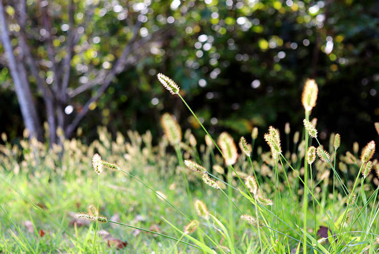 写真教室の会場、牧野植物園内の芝生広場に生えるイネ科の一年草キンエノコロ。その名の通り秋の陽を受け金色に輝く穂が印象的でした。周辺ではダンギクやホトトギス、フヨウなどの魅力的な被写体も見ごろを迎えていました。