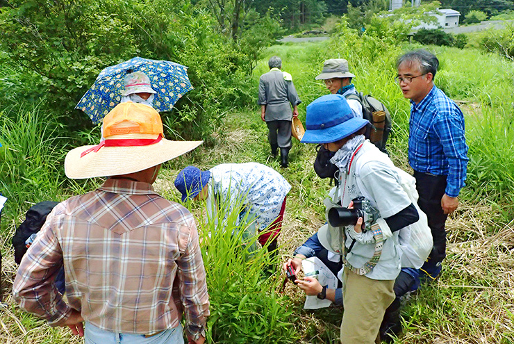 防除活動で汗をかいた後は、地元の方が保全活動をしている湿地で散策会を行いました。皆さん、しゃがみ込んで熱心に観察・写真撮影をしています。植物を愛する人たちには、心癒やされる時間です。