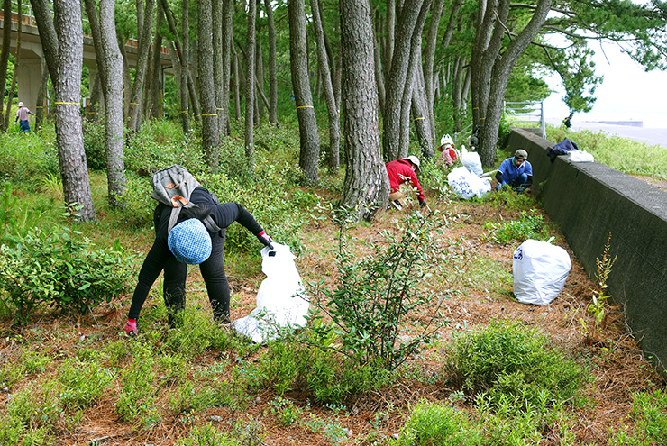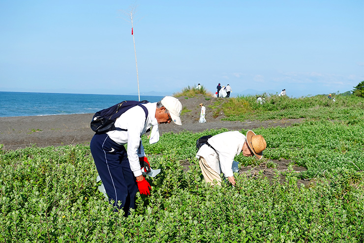 高知県芸西村環境の日、東西4kmにわたる美しい海岸線が有名な琴ヶ浜で、地域住民を含む総勢45名が参加し、外来植物ナルトサワギクの防除活動を行いました。花が小さく見つけにくいナルトサワギクを一心に探します。