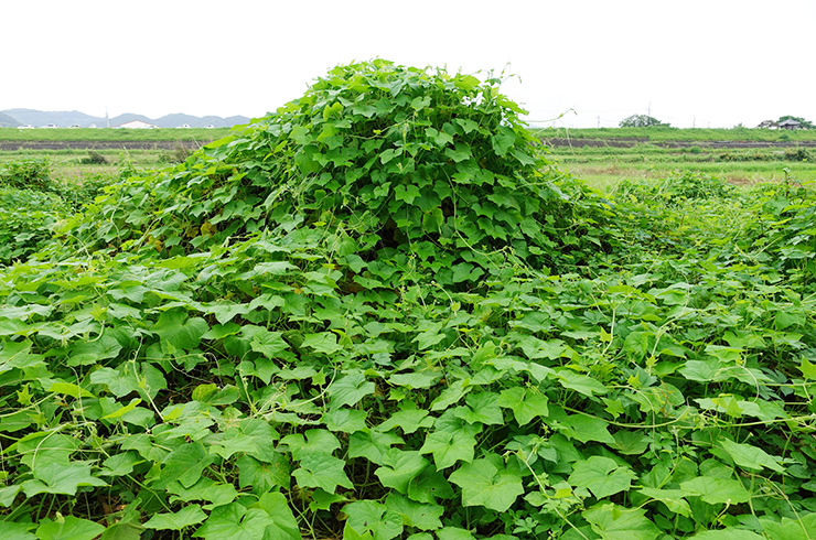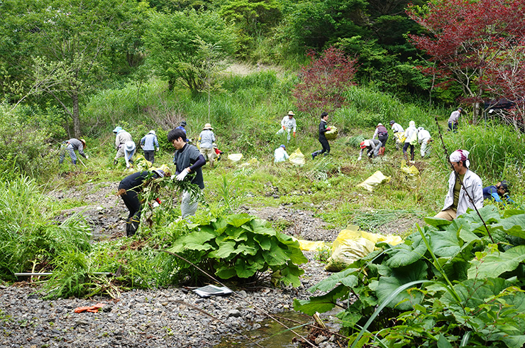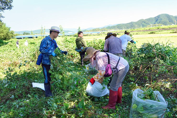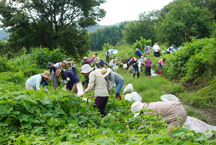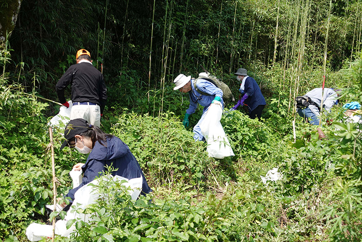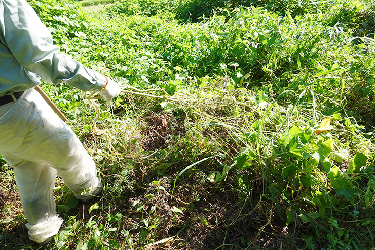 暑さも増す7月上旬の梅雨の晴れ間、高知県高岡群四万十町で実施したアレチウリの防除活動。これまでの雨の影響で足もとのゆるい中、熱中症と新型コロナウイルス対策にも考慮しながらの作業となりました。