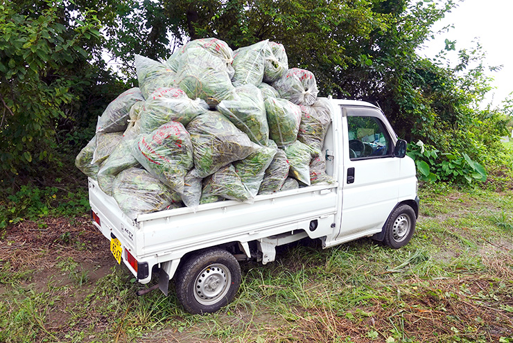 約2時間の防除活動で収集したアレチウリは、軽トラに山盛り2台分。少しでもアレチウリの拡大を食い止めようとみんなで頑張った成果です。