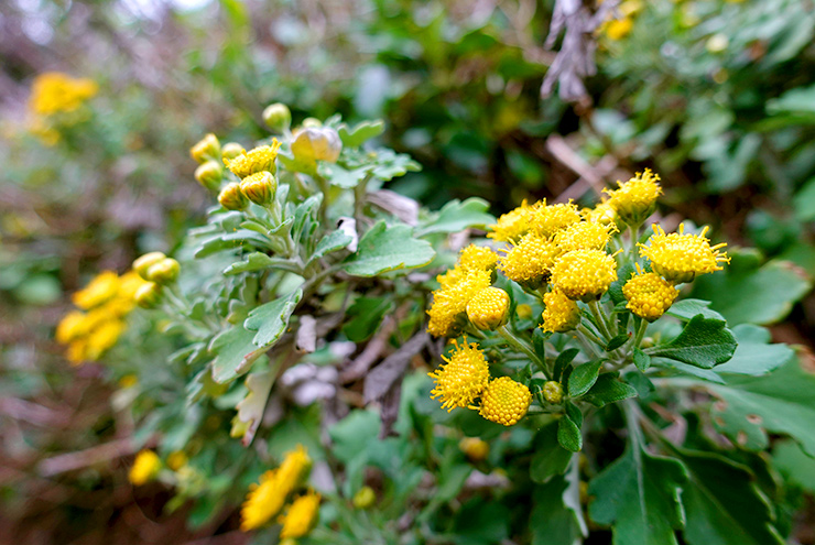 シオギクは高知県物部川東側から徳島県蒲生田岬にかけての海岸に生育し、頭花は筒状花だけでできています。室戸岬のシオギクを守る第一歩として、シオギクを観察し現状を知ることから始めました。