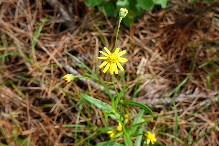 室戸市に自生するシオギクと他の地域からやってきたシオギクが交雑した株の花には、白色の短い花弁(舌状花)があります。このまま交雑種が増え続けると、近い将来、この地域で純粋なシオギクが見られなくなるかもしれません。