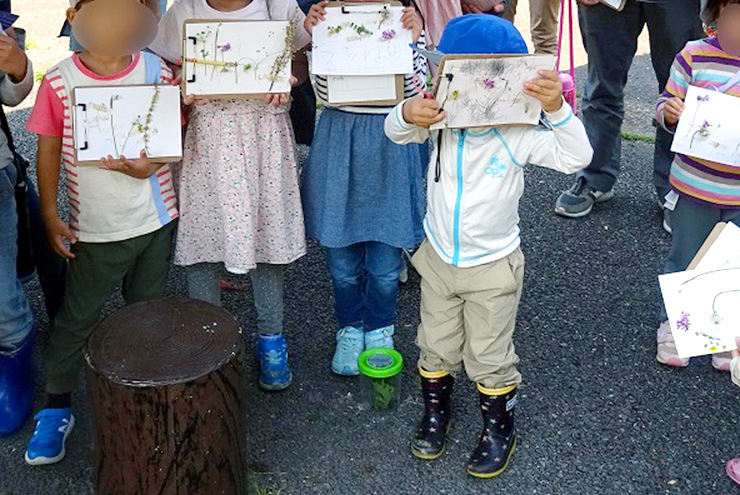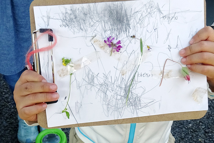 見つけた草花の香りをかいだり触ったり五感で体験した後、「草鬼」をして名前も覚えました。根っこから抜かないよう気をつけて摘んだツボスミレやニワゼキショウ、オヘビイチゴなどで春の草花の標本もつくりました。