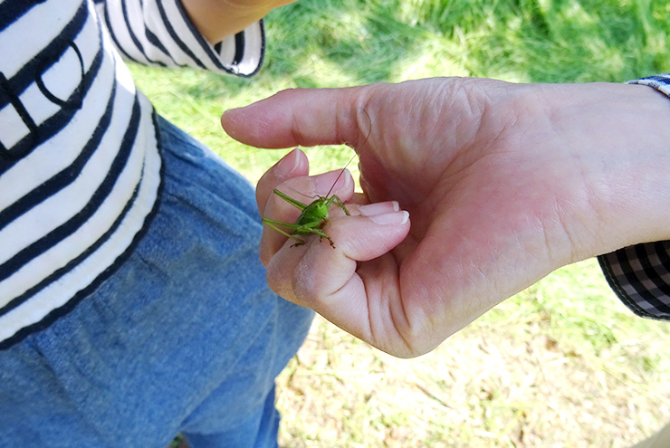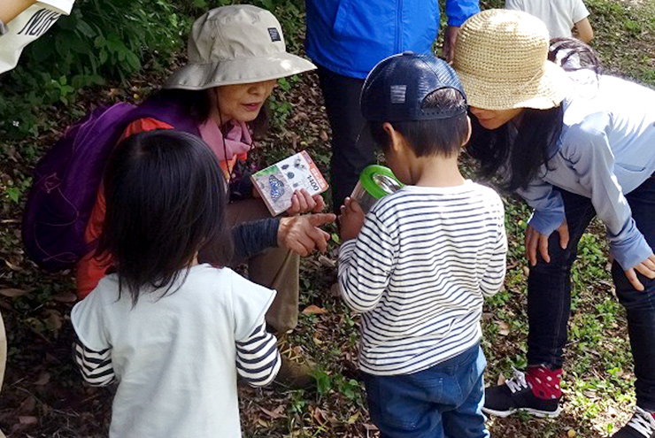 捕まえた虫を一生懸命観察しているお子さんの様子が背中からも伝わってきます。名前だけでなく、その生きものが、他の生きものや環境のつながりの中で、どんな役割を持っているか観察から発見を促すというのは素晴らしいアプローチです。