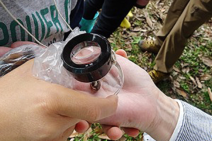 アラカシのドングリの中の幼虫を発見!ルーペで観察した後は、土にもぐれるようそっと戻してあげました。