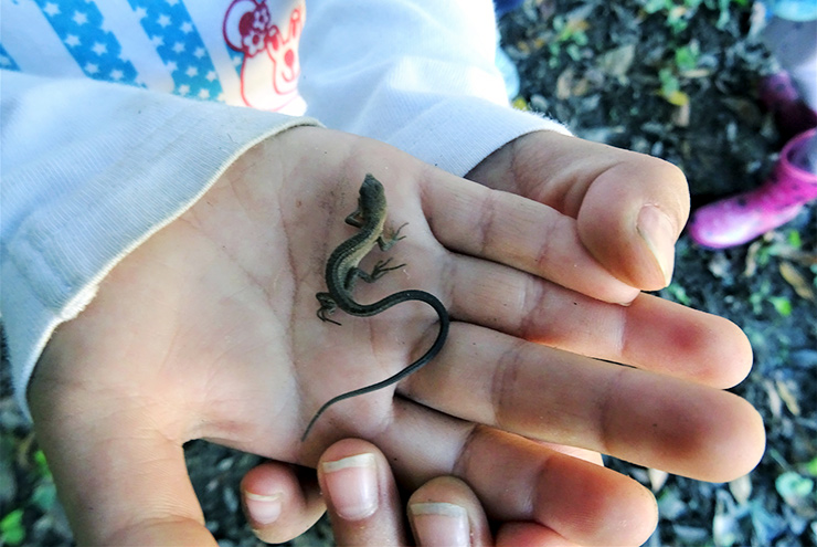ニホンカナヘビを見つけた子供たち。「可愛いいね」よく観察した後、逃がしてあげました。