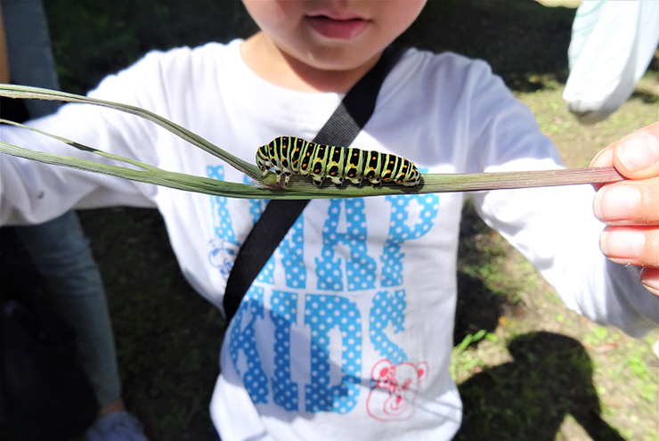 「キアゲハの幼虫見つけたよ」。よく観察した後、逃がしてあげました。